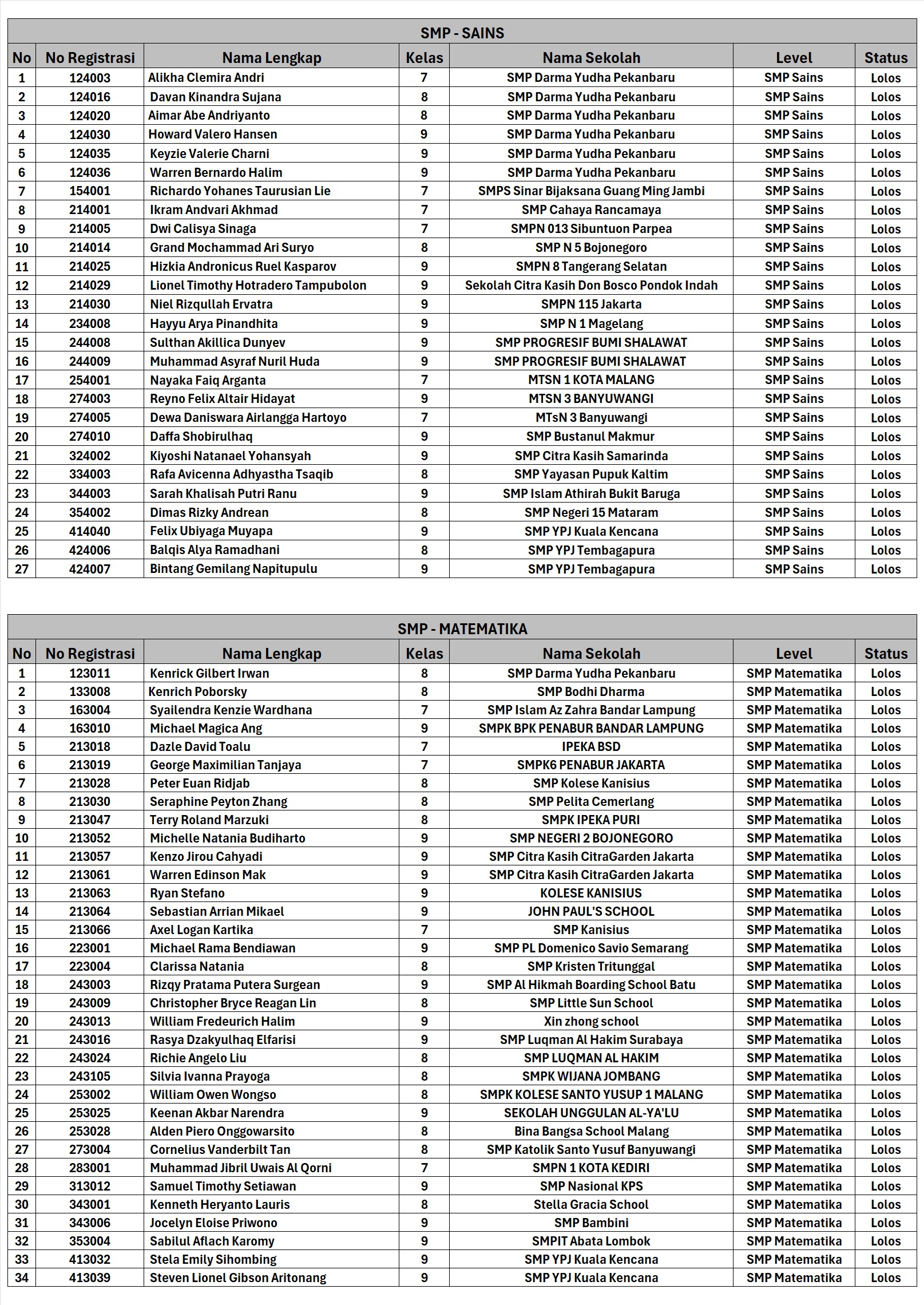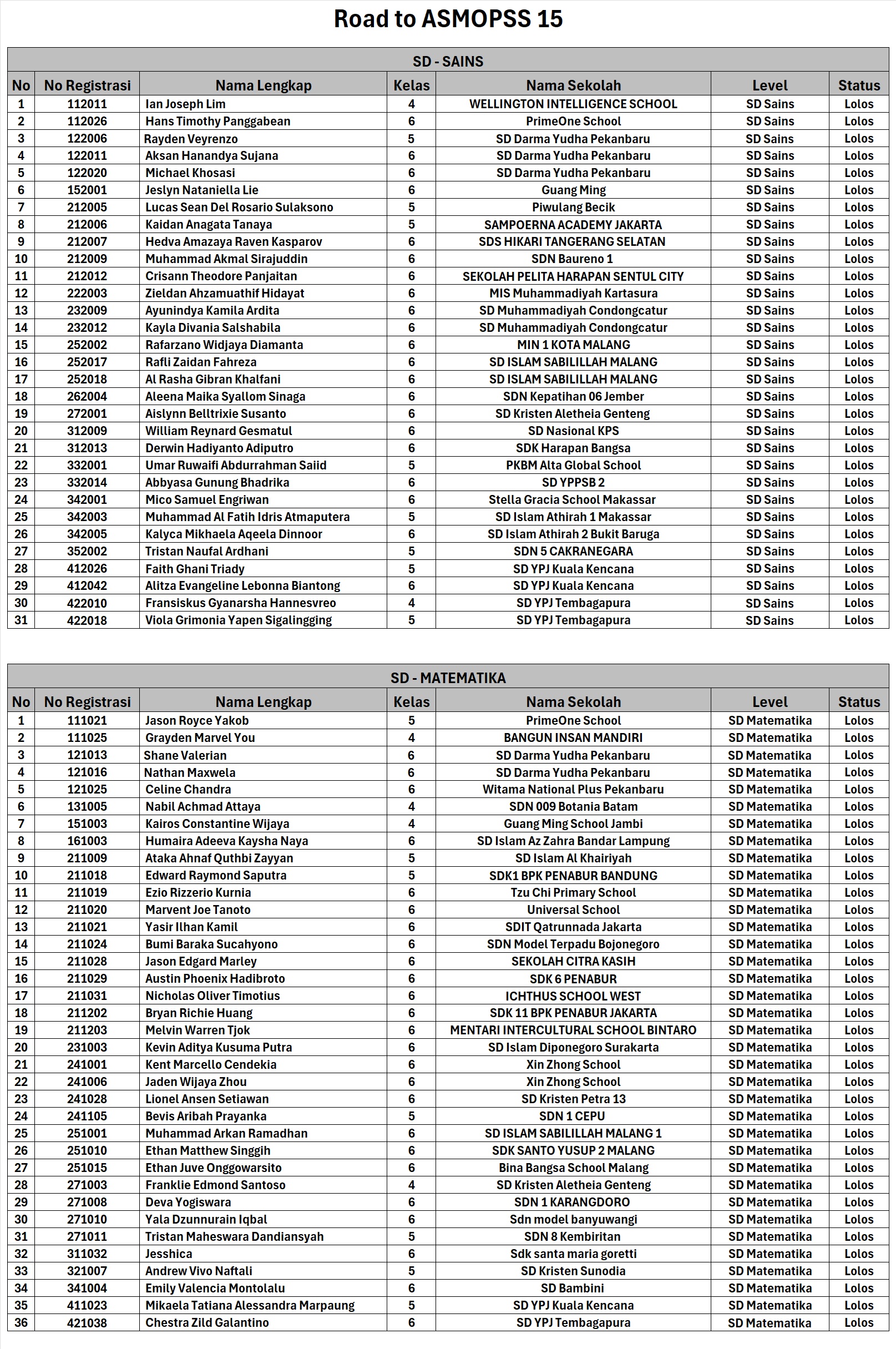 Para peserta yang lolos akan mengikuti Seleksi Pemilihan Tim Nasional (Seleksi Nasional) ASMOPSS 15 yang dilaksanakan secara ONLINE pada 20 September 2025. Surat undangan resmi dan informasi mengenai pelaksanaan Seleksi Nasional akan dikirimkan melalui email yang terdaftar di panitia.